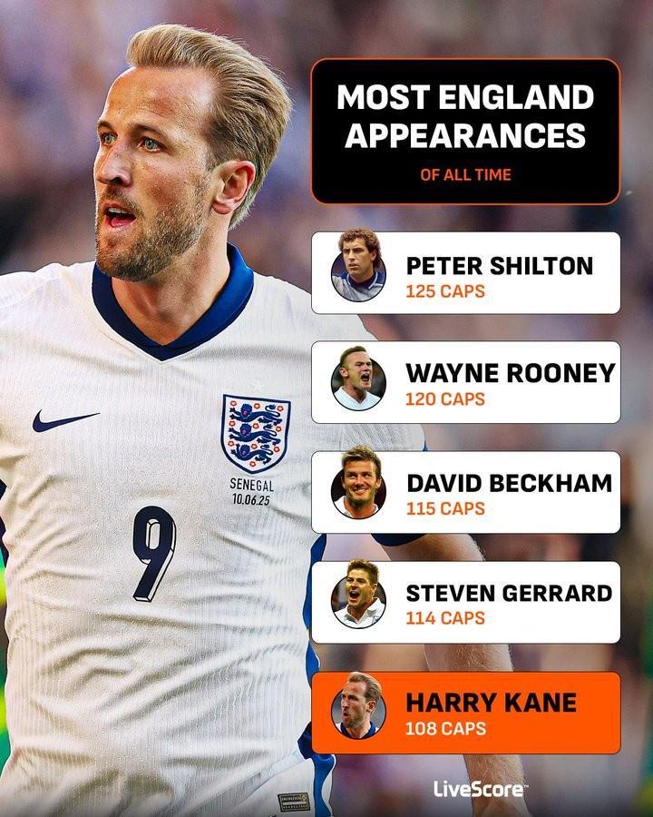 凯恩已为英格兰出场108次,队史第五&差追平第一名希尔顿还差17场