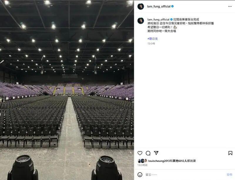 他(29日)昨晚在社交平台上载身在场馆拍摄的照片,透露声带仍然肿胀,希望今晚能演出顺利。他说︰拉阔音乐会踩台完成。病了几日,以为今日情况会好些,谁知声带还是好肿。希望明天一切顺利!期待同你的一起大合唱,明天见﹗