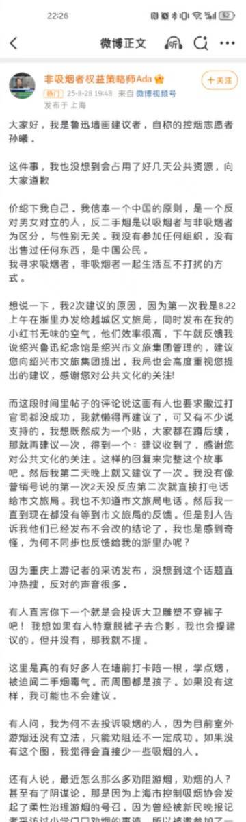 28日晚,投诉绍兴鲁迅纪念馆鲁迅夹烟墙画的当事人孙女士@非吸烟者权益策略师Ada 在微博发布长文回应事件,并为占用公共资源空间致歉。